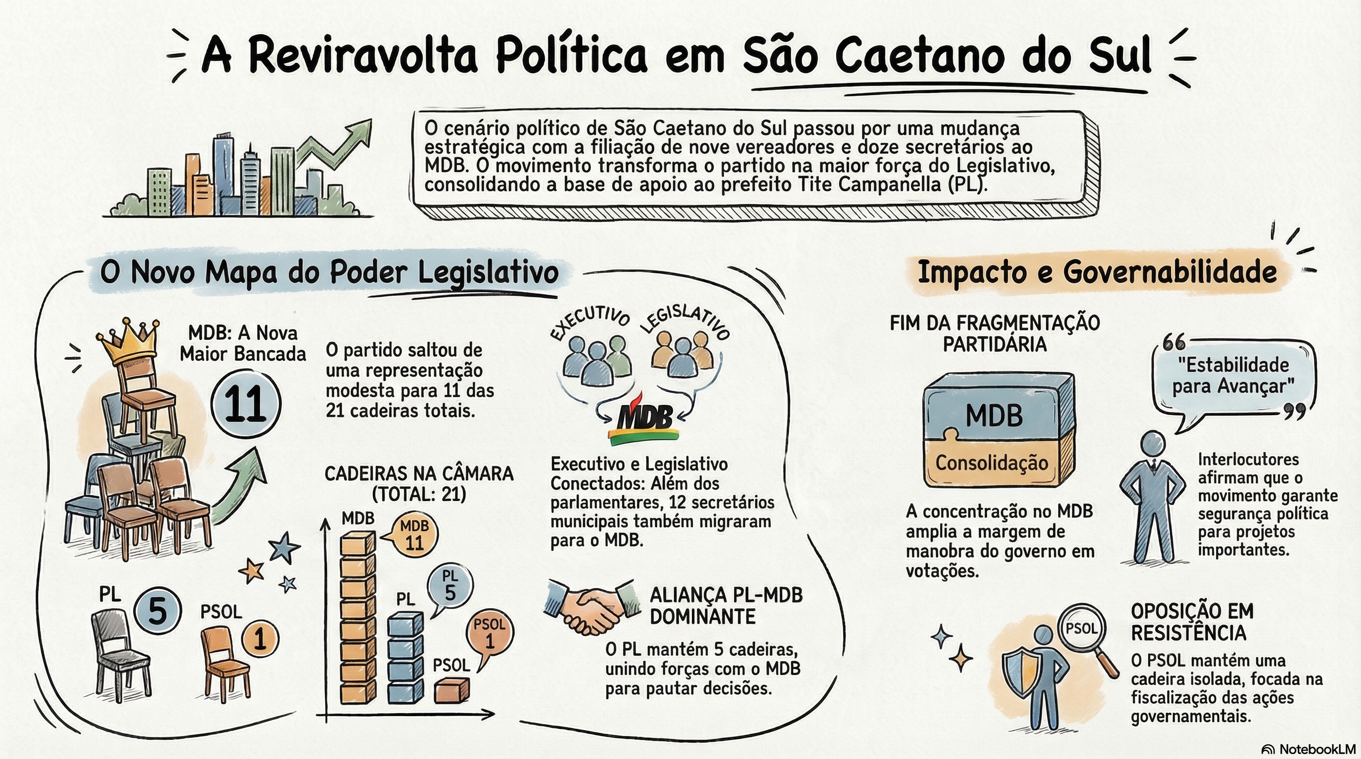 O cenário político de São Caetano do Sul sofreu uma reviravolta significativa com a filiação de nove vereadores ao MDB. A movimentação, considerada estratégica, transformou o partido em protagonista da Câmara Municipal, que conta com 21 cadeiras. Antes com representação modesta, o MDB passa a ocupar 11 assentos, quase metade do Legislativo.